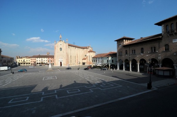 Maestosa, luminosa, vero cuore pulsante della città la piazza, detta Listòn in Veneto, col suo fregio uguale a quello di Piazza S. Marco, testimonia la presenza veneziana a Montagnana che ne cambiò la destinazione da avamposto militare di confine ad attivo centro di commercio. Originariamente era in mattoni e dalla seconda metà del ‘700 ha l’attuale pavimentazione. Particolarmente felice l’orientamento del Duomo, obliquo rispetto all’asse della piazza, che consente di cogliere in un solo colpo d’occhio la facciata ed il fianco.